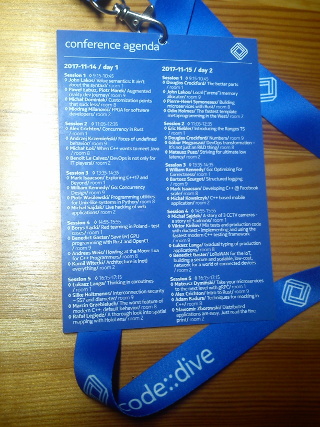 Code::dive 2017 was a free conference held in Wrocław, Poland. The conference was organized and sponsored by Nokia Poland. The fourth edition took two days (14-15 November), it was in a huge cinema near the city center. There were five sessions, in each session one could choose from four lectures. In total 40 talks in two days, awesome.